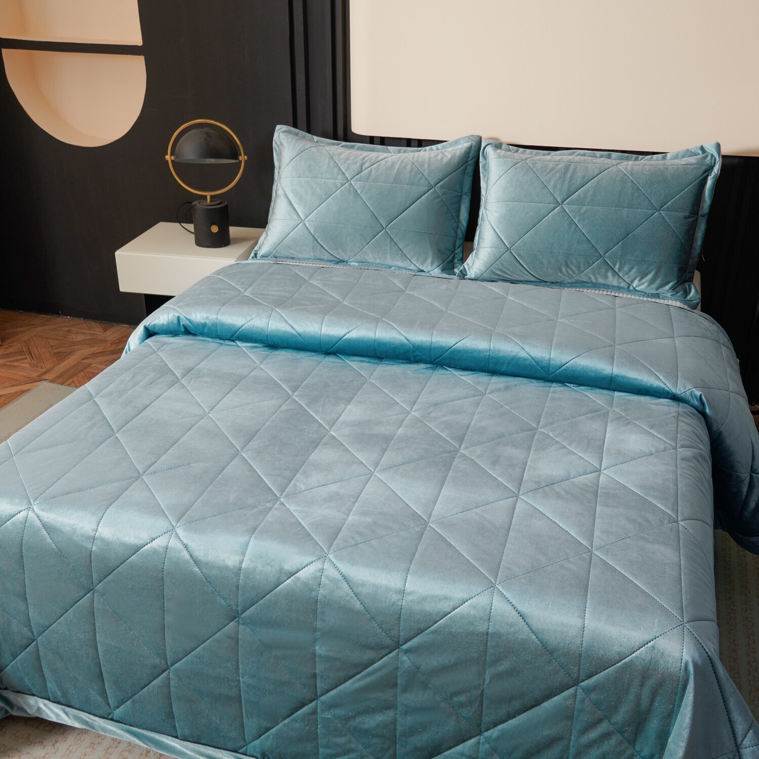 Геометрический узор на покрывале выполнен с использованием термостежки, что придаёт изделию особую изысканность и подчёркивает элегантность интерьера.