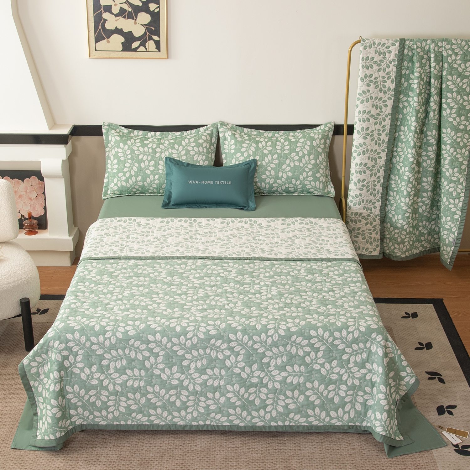 Покрывало выполнено из жаккардового муслина с декоративной простёжкой, формирующей утончённый рельефный узор. Ткань отличается мягкостью, лёгким благородным блеском и изысканной текстурой. Завершает композицию широкий кант в тон простыни, который визуально объединяет все элементы комплекта и придаёт образу гармоничную завершённость.