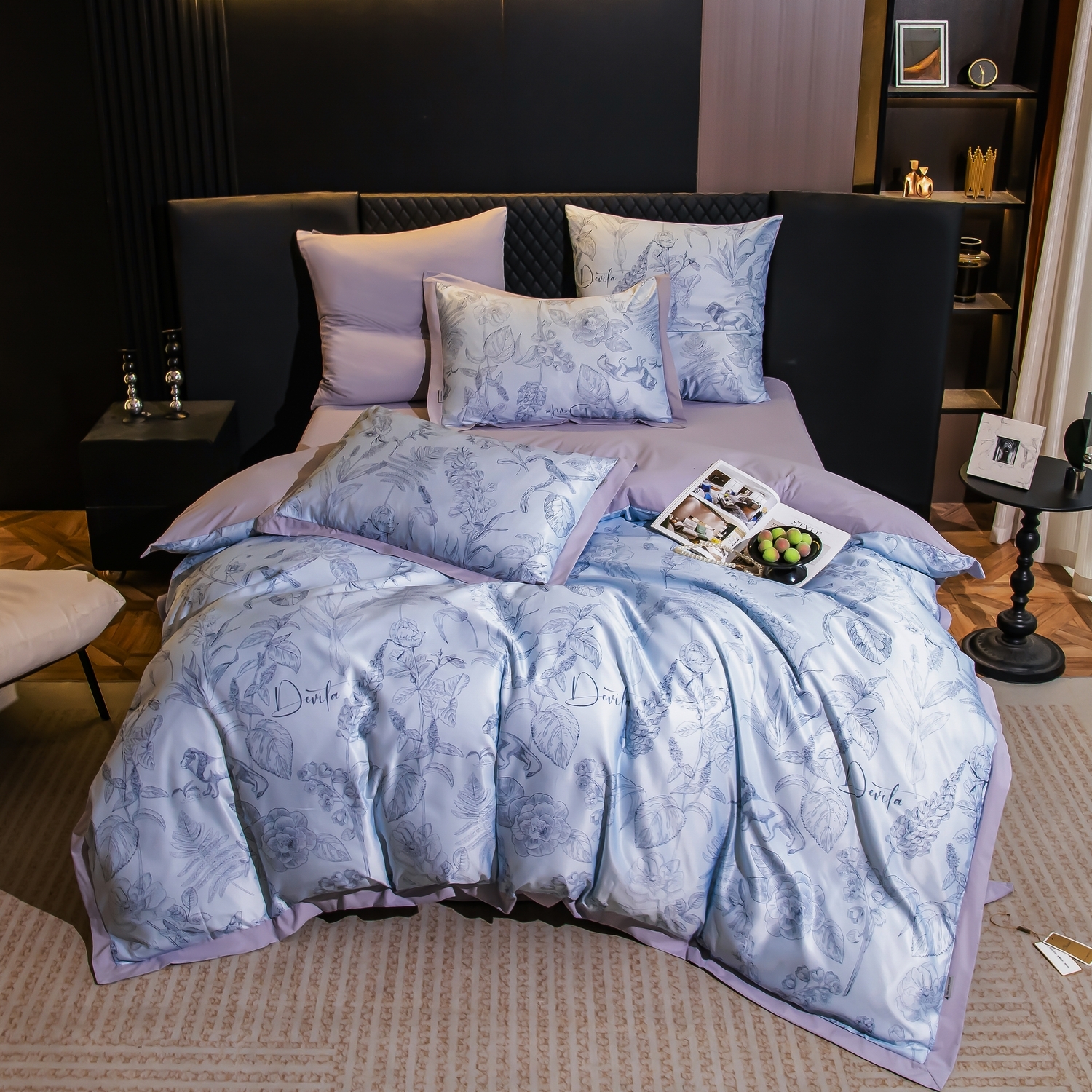 Ткань компаньон: Верх пододеяльника - мерсеризованный сатин, низ пододеяльника - сатин. Наволочки 50*70 см и 70*70 см с разных сторон разной расцветки. Пододеяльник с разных сторон разного цвета. Простыня однотонная такого же цвета, как низ пододеяльника.