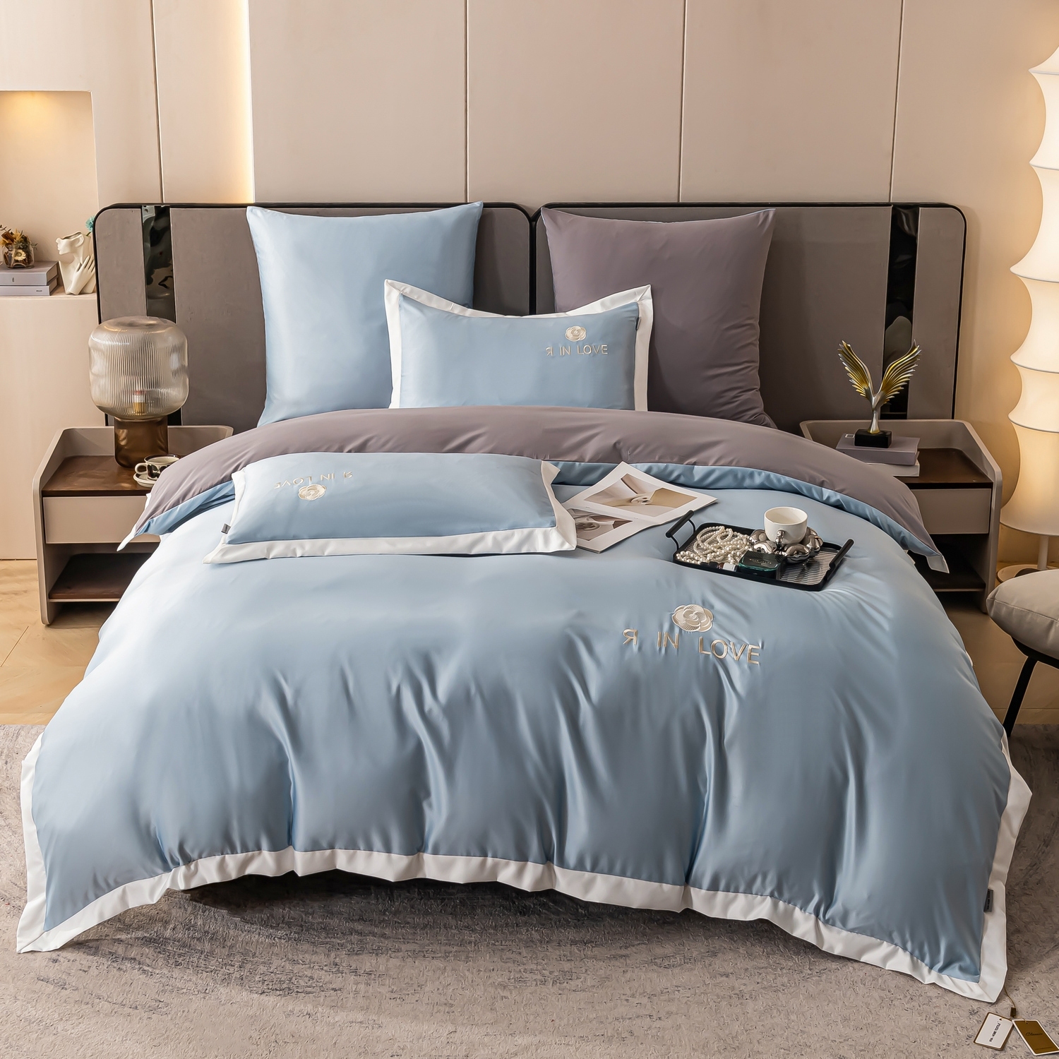 Каждый комплект украшен элегантной вышивкой с цветком и фразой "Я IN LOVE". Это придает постельному белью особый шарм, делая его прекрасным подарком для любимых.