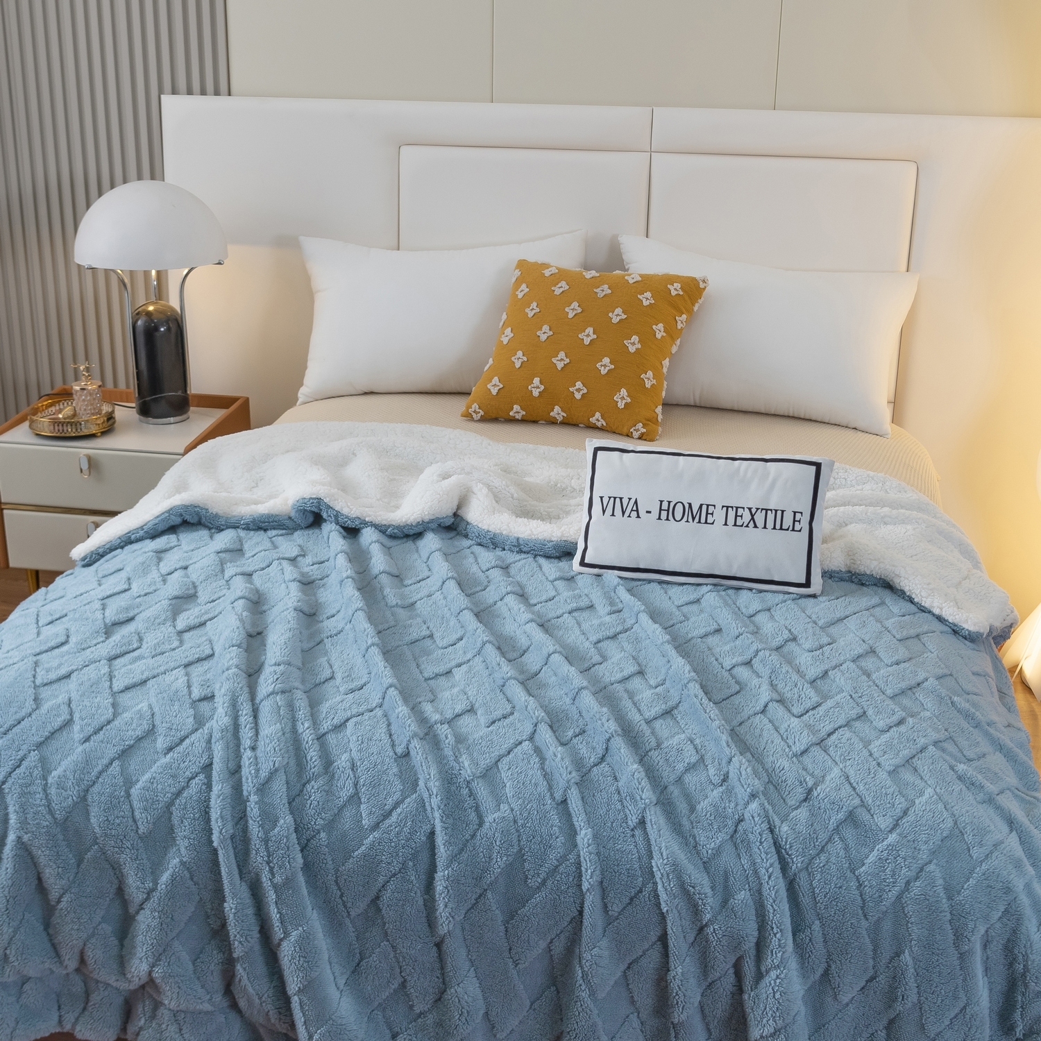Габариты: 50 x 40 x 20 см, Упаковка: Сумка ПВХ на шнуровке, Цвет: Белый; Голубой, Рисунок: Геометрический узор, Транспортировочная упаковка: 51.000/41.000/24.000, Состав: 100% бамбуковая микрофибра, Яндекс Видео: https-//disk.yandex.ru/i/aVROA0IDK-6jsQ, Яндекс Фото: https-//yadi.sk/d/9kgy59JF8D2Epw, Внешние особенности: с внутренней стороны белый цвет без узора; а с внешней стороны другой цвет с декоративным узором в технике "Тиснение 3D", Материал: Бамбуковая микрофибра, Состав материала: 100% пэ, Плед-покрывало: 150*200 см