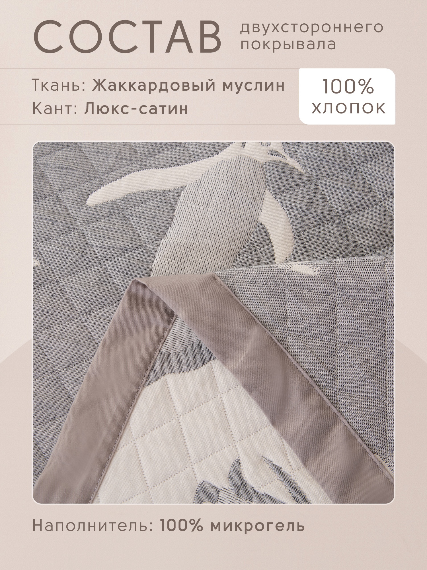 Покрывало выполнено из жаккардового муслина с декоративной простёжкой, формирующей утончённый рельефный узор. Ткань отличается мягкостью, лёгким благородным блеском и изысканной текстурой. Завершает композицию широкий кант, придающий изделию гармоничную завершённость.