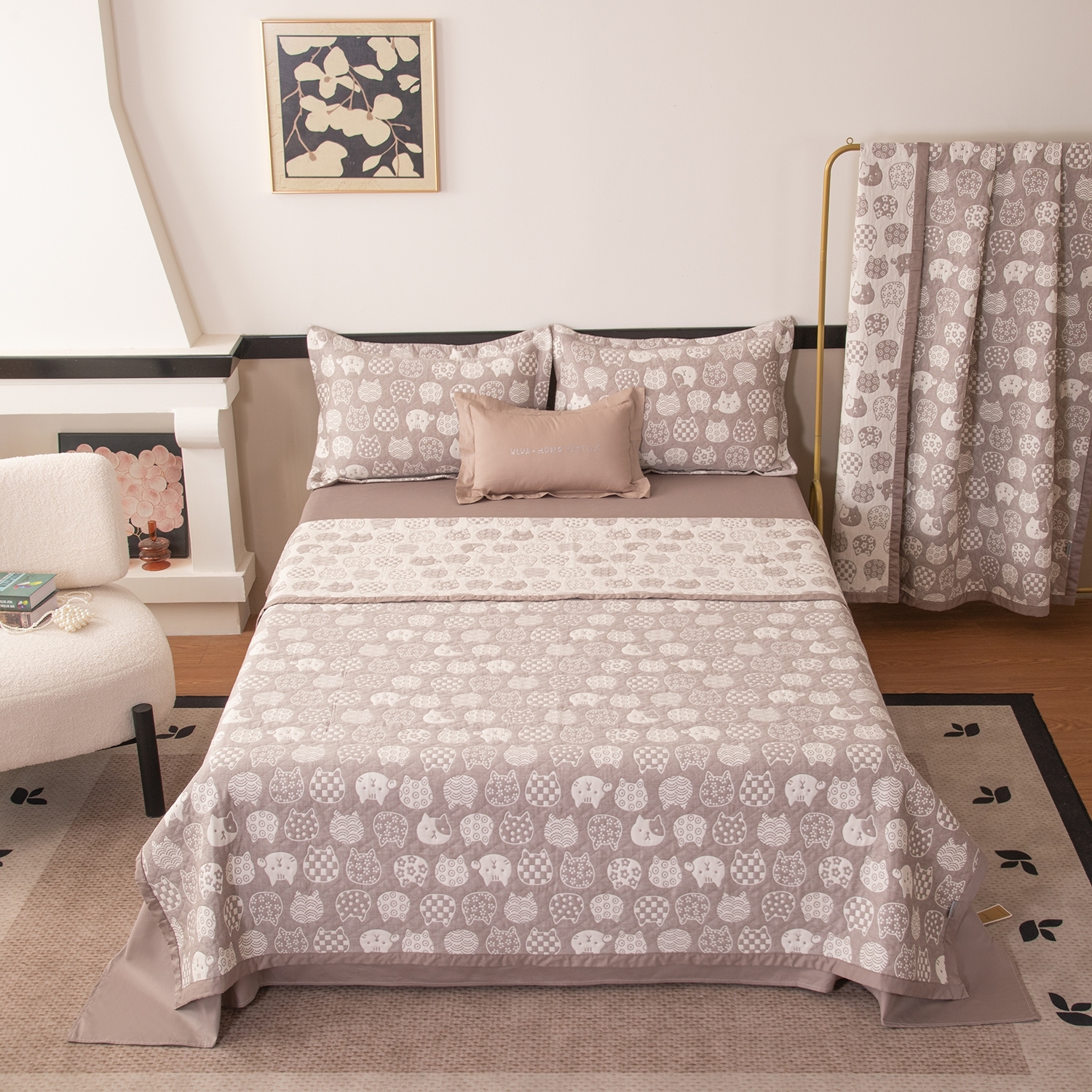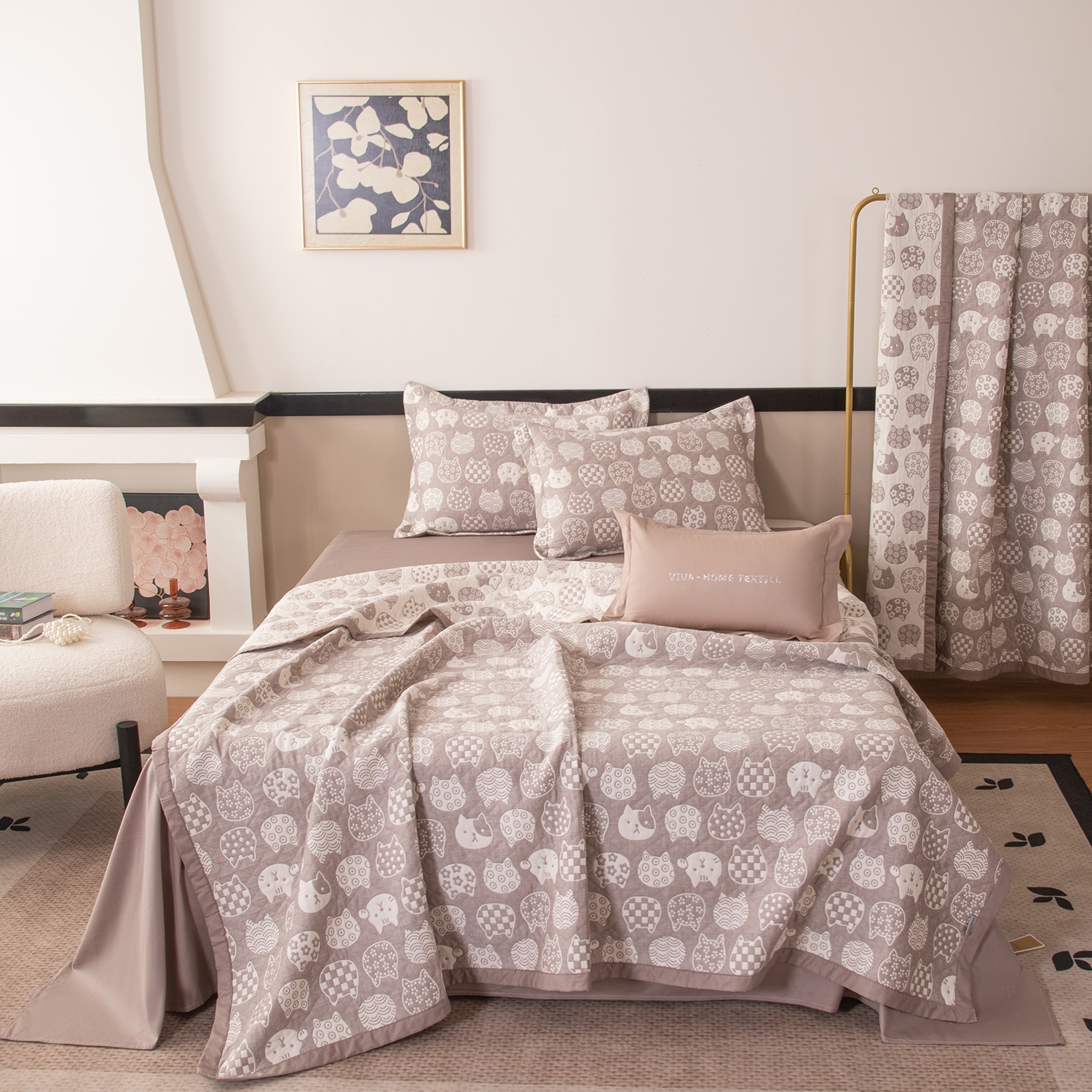Покрывало выполнено из жаккардового муслина с декоративной простёжкой, формирующей утончённый рельефный узор. Ткань отличается мягкостью, лёгким благородным блеском и изысканной текстурой. Завершает композицию широкий кант в тон простыни, который визуально объединяет все элементы комплекта и придаёт образу гармоничную завершённость.