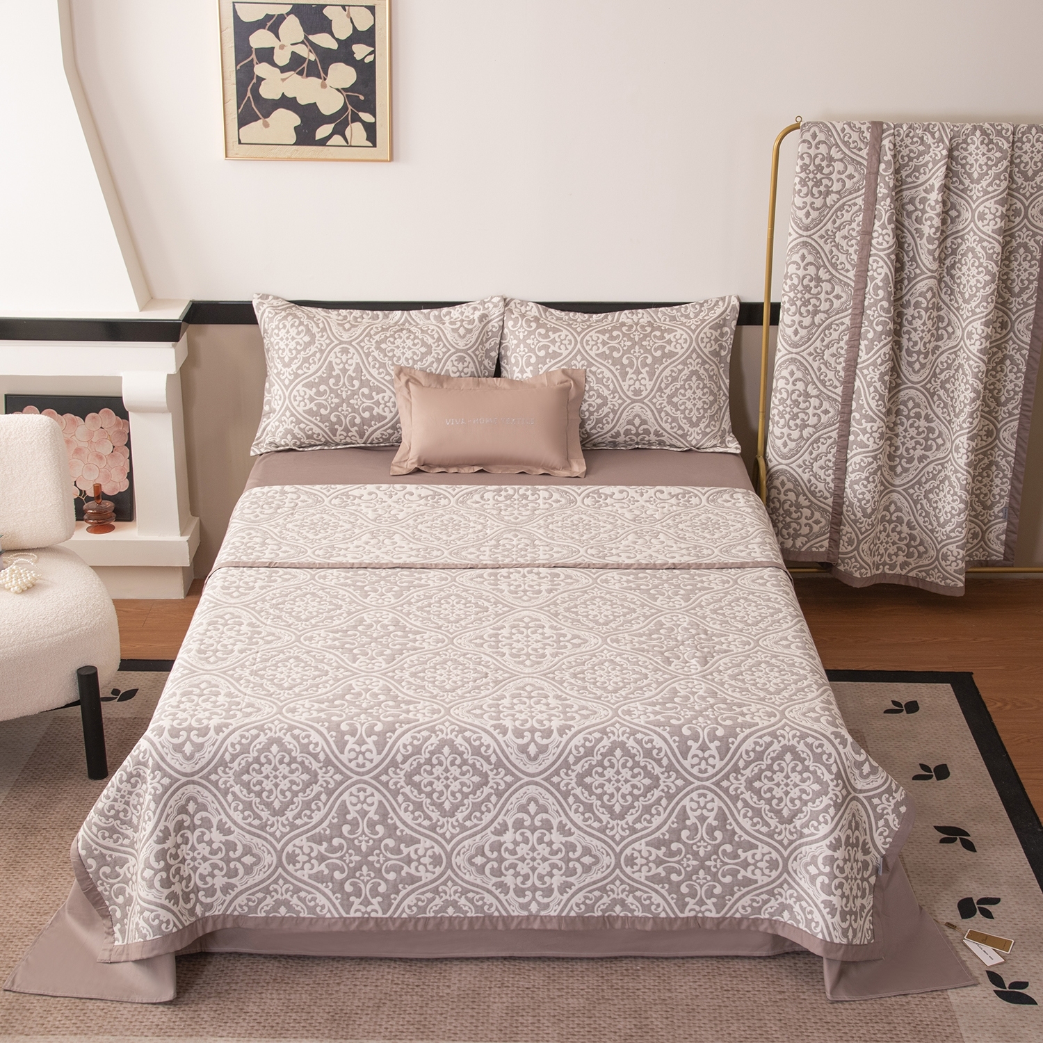 Покрывало выполнено из жаккардового муслина с декоративной простёжкой, формирующей утончённый рельефный узор. Ткань отличается мягкостью, лёгким благородным блеском и изысканной текстурой. Завершает композицию широкий кант в тон простыни, который визуально объединяет все элементы комплекта и придаёт образу гармоничную завершённость.