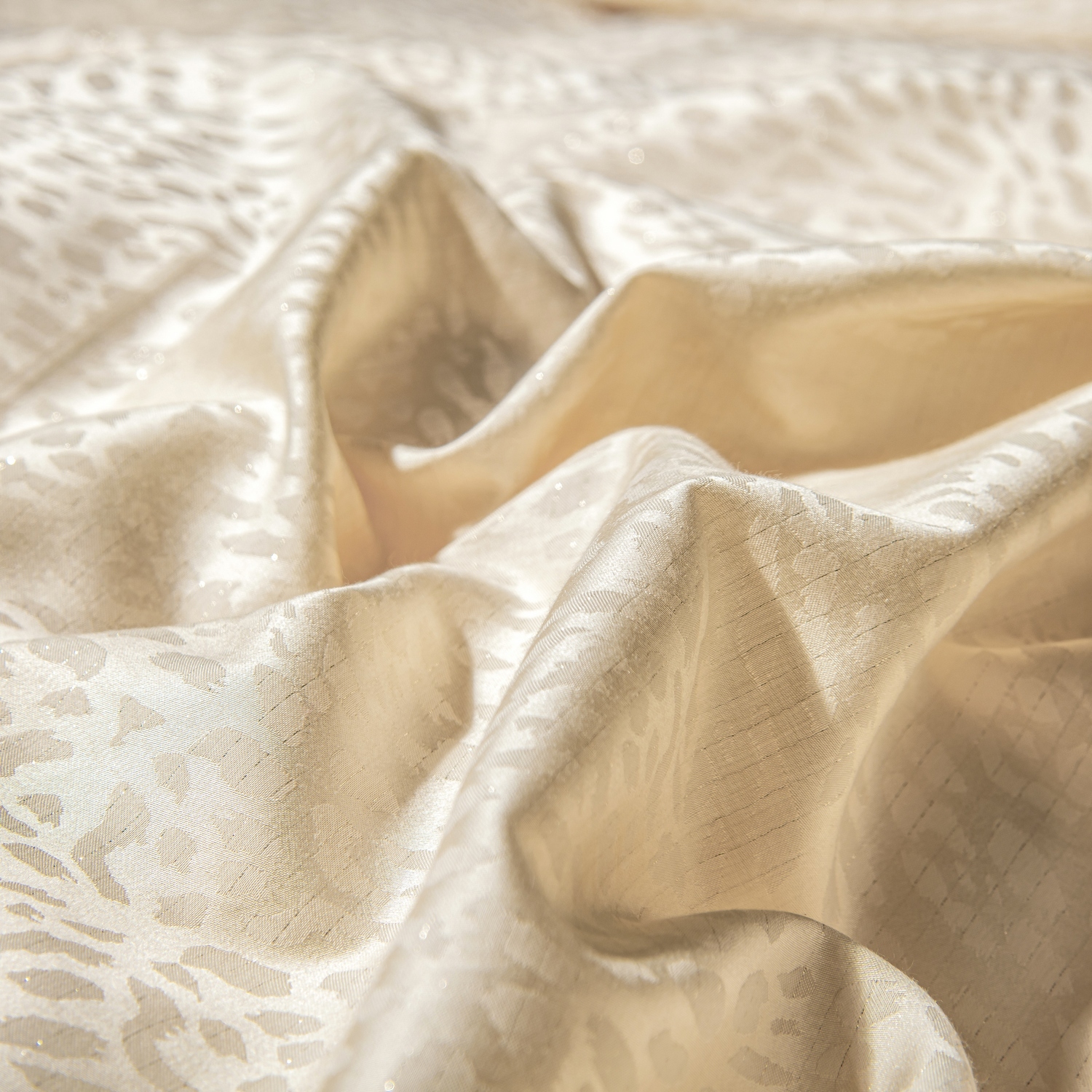 Жаккард из 100% хлопка, сотканный на специальных станках, впечатляет сложным рельефным рисунком. В переплетении используются тонкие золотые нити, которые мягко играют на свету, создавая мерцающий эффект, глубину узора и ощущение изысканной роскоши. Такой текстиль выглядит статусно и подчёркивает индивидуальность интерьера.