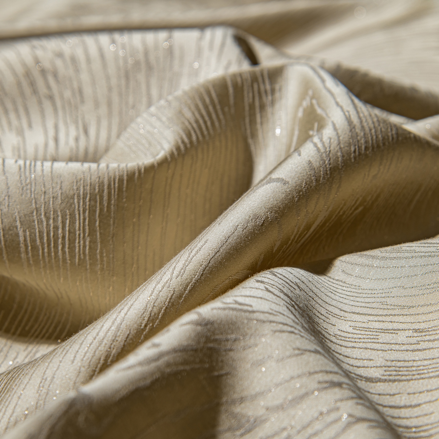 Жаккард из 100% хлопка, сотканный на специальных станках, впечатляет сложным рельефным рисунком. В переплетении используются тонкие золотые нити, которые мягко играют на свету, создавая мерцающий эффект, глубину узора и ощущение изысканной роскоши. Такой текстиль выглядит статусно и подчёркивает индивидуальность интерьера.