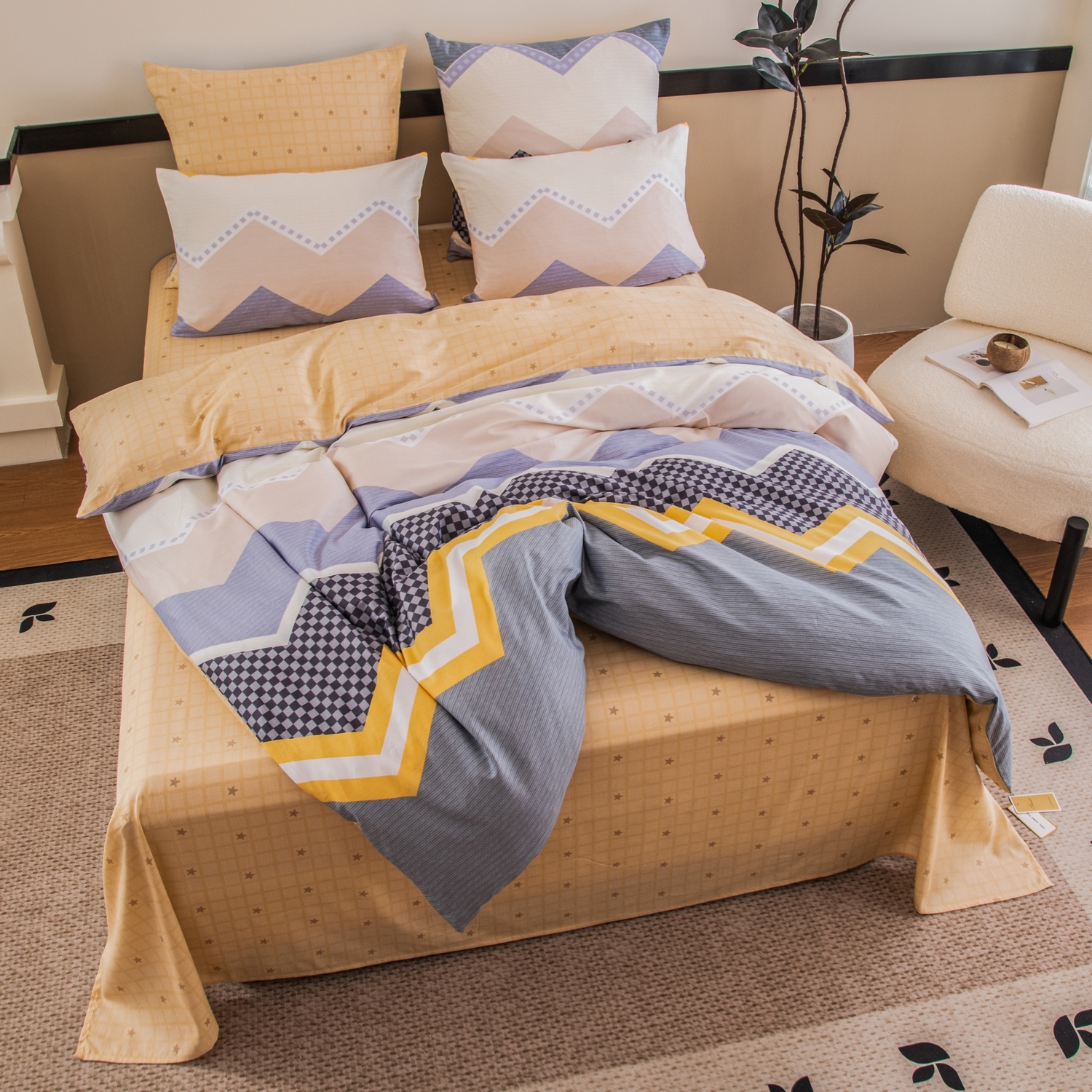 Ткань компаньон: Наволочки с разных сторон разной расцветки, пододеяльник с разных сторон разного цвета, простыня такого же цвета, как низ пододеяльника.