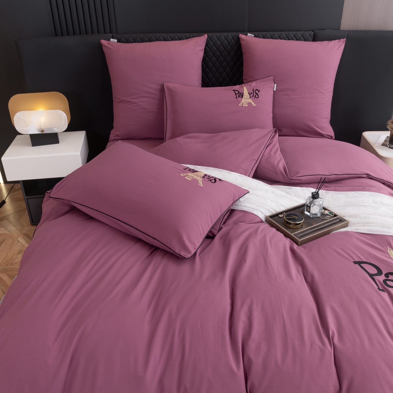 Дизайн дополняет элегантная вышивка с изображением Эйфелевой башни и надписью Paris, а изящный кант по периметру подчёркивает утончённость каждого комплекта.