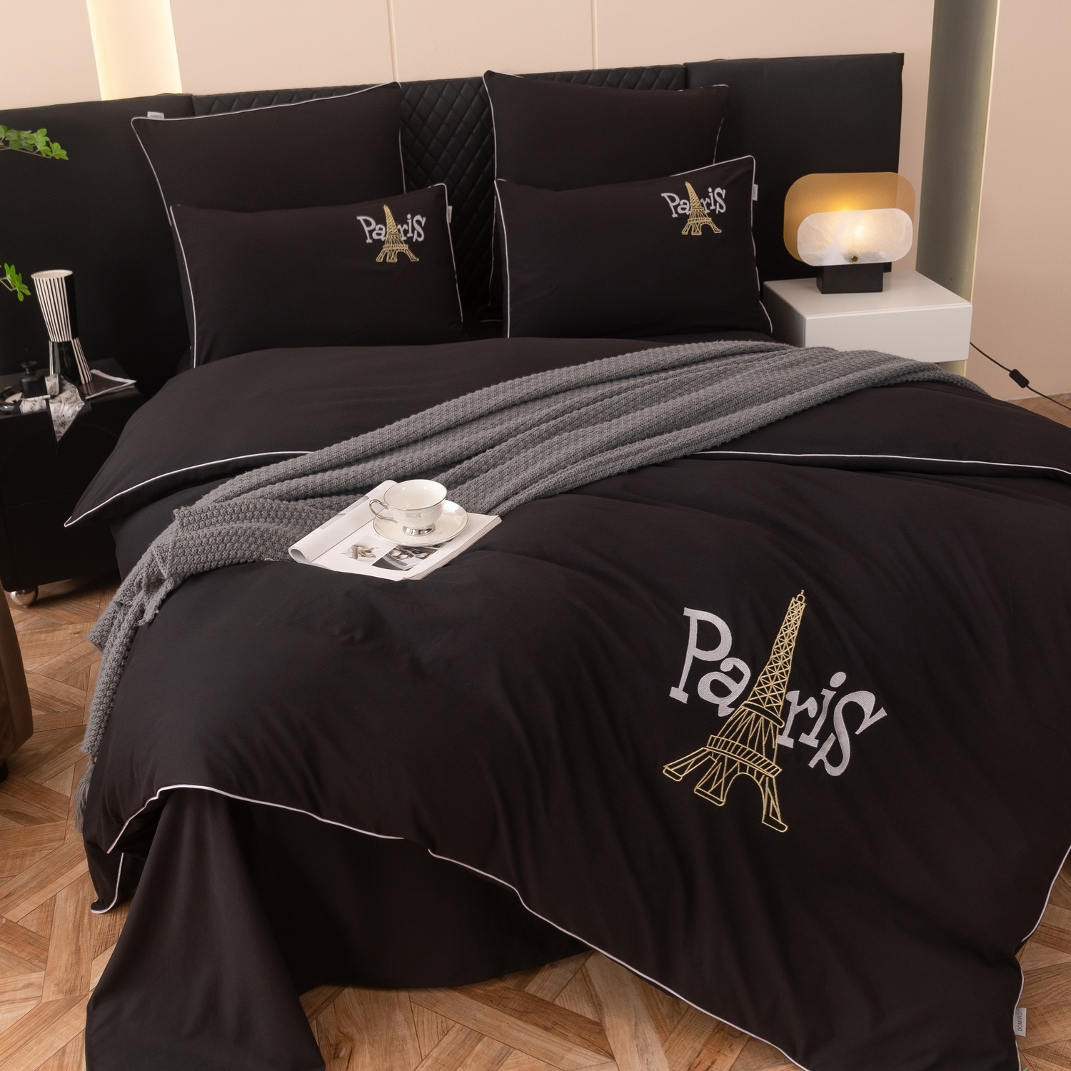 Дизайн дополняет элегантная вышивка с изображением Эйфелевой башни и надписью Paris, а изящный кант по периметру подчёркивает утончённость каждого комплекта.