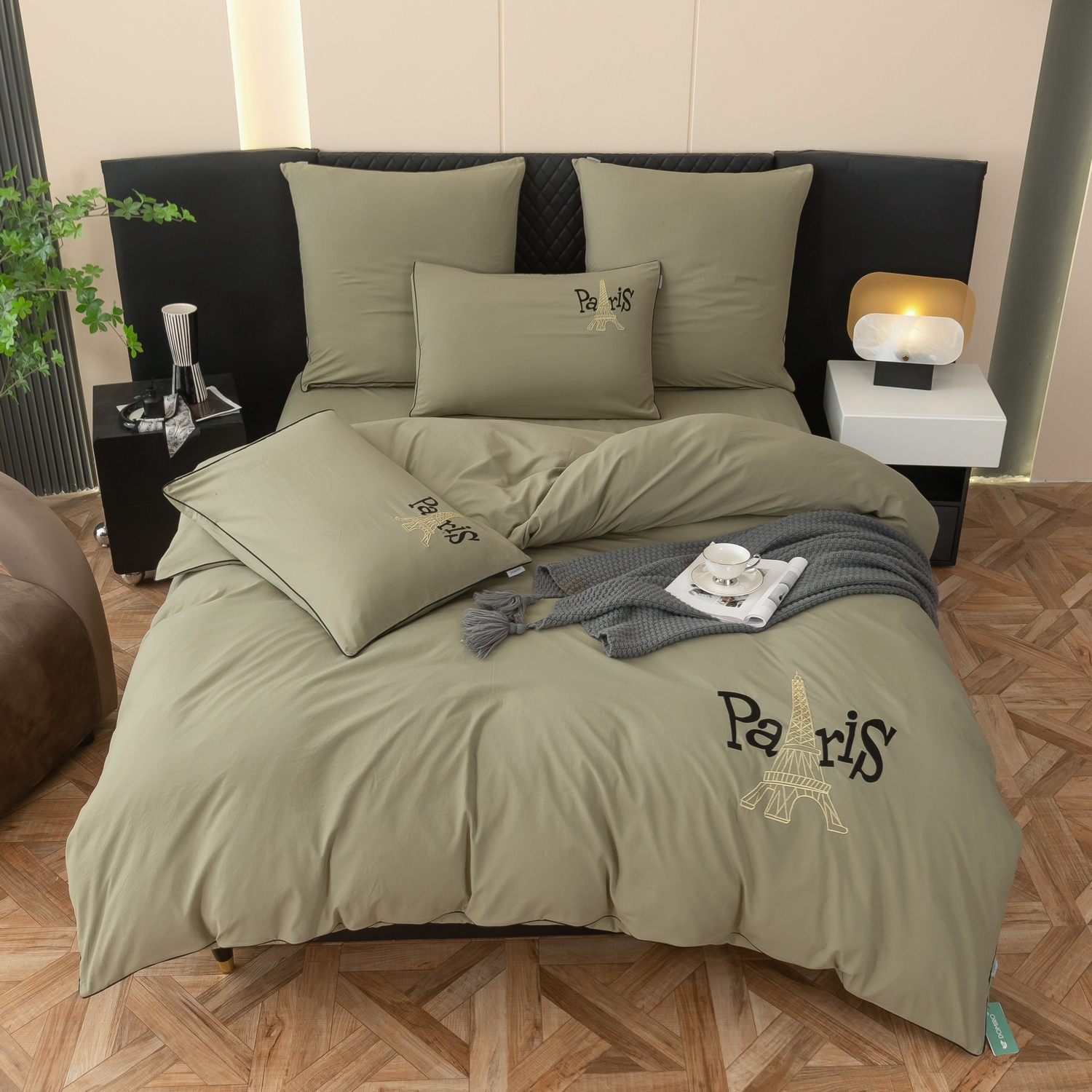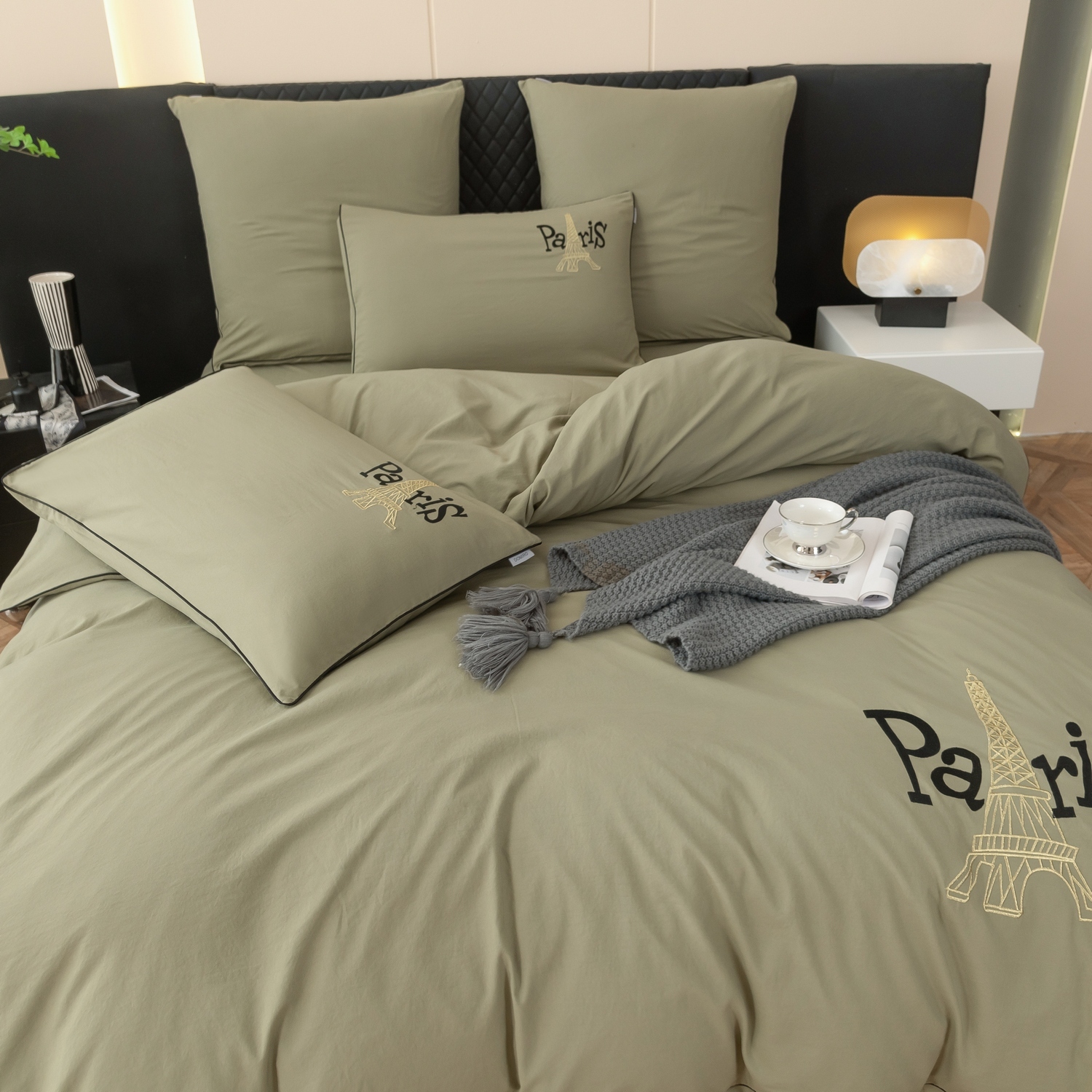 Дизайн дополняет элегантная вышивка с изображением Эйфелевой башни и надписью Paris, а изящный кант по периметру подчёркивает утончённость каждого комплекта.