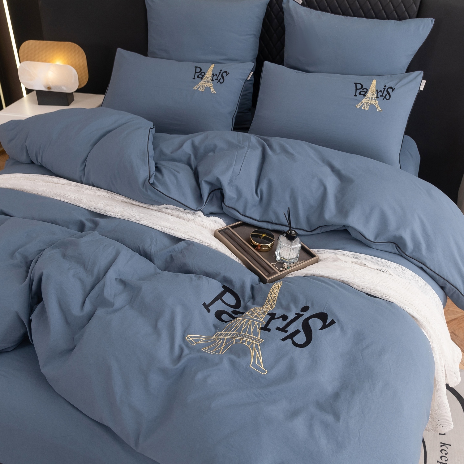 Дизайн дополняет элегантная вышивка с изображением Эйфелевой башни и надписью Paris, а изящный кант по периметру подчёркивает утончённость каждого комплекта.