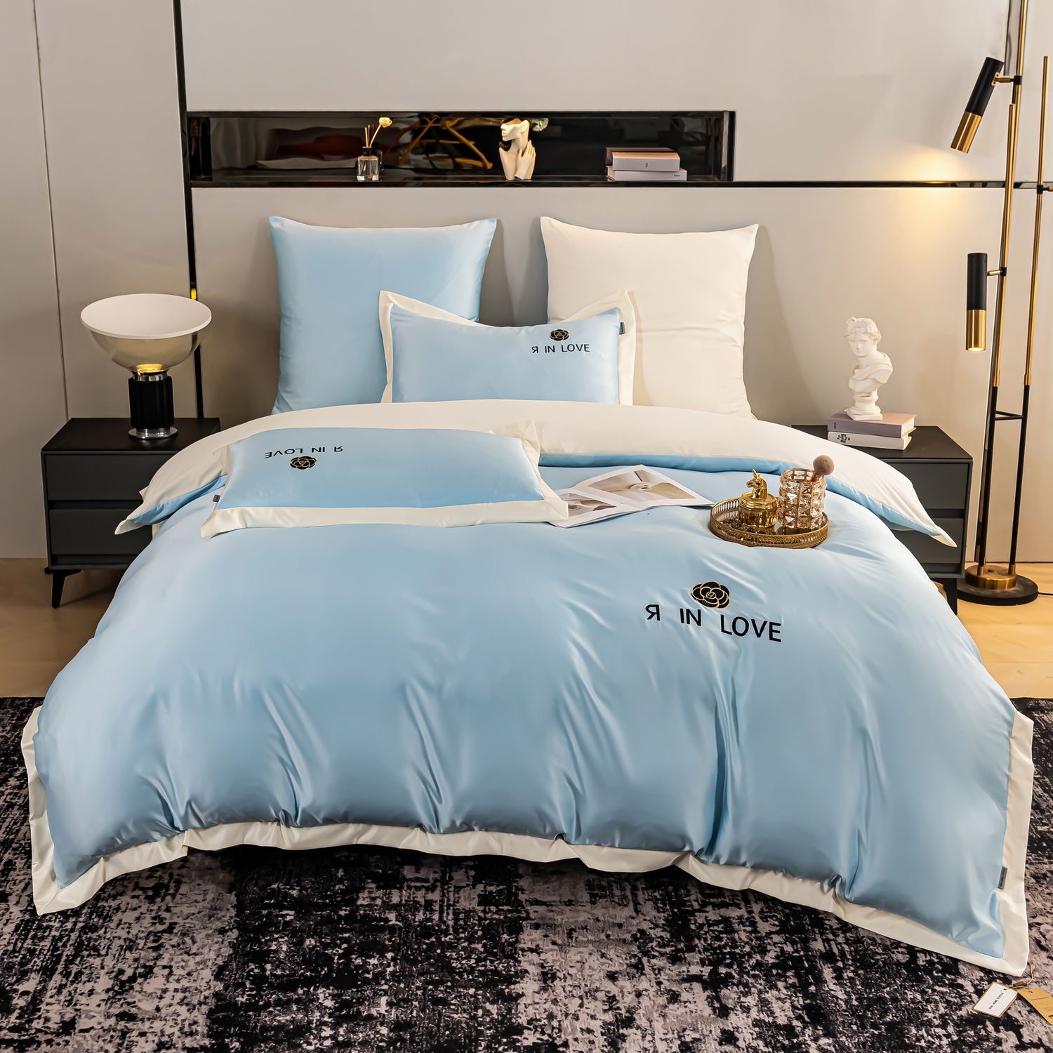Каждый комплект украшен элегантной вышивкой с цветком и фразой "Я IN LOVE". Это придает постельному белью особый шарм, делая его прекрасным подарком для любимых.