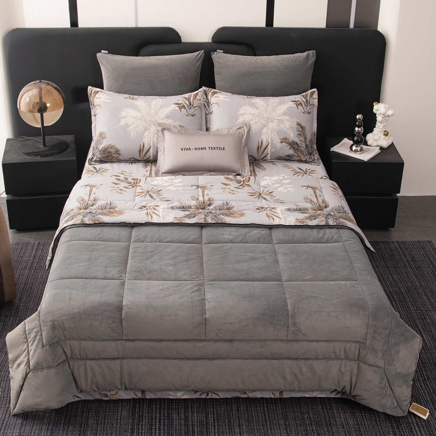 Габариты: 50 x 40 x 20 см, Цвет: Серый; Средне-темный серый; Коричневый; Бежевый, Рисунок: Веточки; Для бабушки; Для девушки/сестры; Для мужчин; Листья; Пальмы, Упаковка: ПВХ сумка, Тип простыни: На резинке, Транспортировочная упаковка: 51.000/41.000/24.000, Состав: Велюр/100% хлопок | наполнитель одеяла- 100% эковолокно микрогель, Яндекс Видео: https-//yadi.sk/i/HvEa_wHHA-jgIQ, Яндекс Фото: https-//yadi.sk/d/ExWjB_kciyEZPw, Яндекс Фото 3x4: https-//yadi.sk/d/S77AAL_nSM7F8g, Комплект постельного белья Сатин Velouria Luxe с Одеялом - это сочетание изысканного дизайна; премиальных материалов и максимального комфорта. Вам больше не придётся тратить время на заправку одеяла в пододеяльник: его заменяет стеганое одеяло-покрывало; которое сразу идёт в комплекте и полностью соответствует дизайну белья, В комплект входят четыре наволочки: 50x70 см (2 шт) с запАхом (кармашком) выполнены из сатина 100% хлопка; с ушками и широким кантом по периметру; 70x70 см (2 шт) на молнии - верх из мягкого велюра; низ из сатина 100% хлопка; оформлены бархатным кантом, Ткань компаньон: Одеяло и наволочки 70x70 с разных сторон разной расцветки и ткани; наволочки 50x70 с разных сторон разной расцветки (принт/однотонный); простыня такого же цвета; как низ одеяла, Ткань: Сатин/Велюр, Плотность: 130 гр/м2 (сатин) / 240 гр/м2 (велюр), Метод окрашивания: Пигментное (сатин), Одеяло-покрывало (стеганое): 100% эковолокно микрогель (наполнитель), Наволочки 50x70: Украшены широким кантом по периметру, Наволочки 70x70: Украшены бархатным кантом по периметру, Одеяло-покрывало: 200*220 см 1 шт. (стеганое), Простыня: (180/160/140)*200*25 см 1 шт. (на резинке), Наволочки: 50*70 см 2 шт. (с запАхом) и 70*70 см 2 шт. (на молнии)