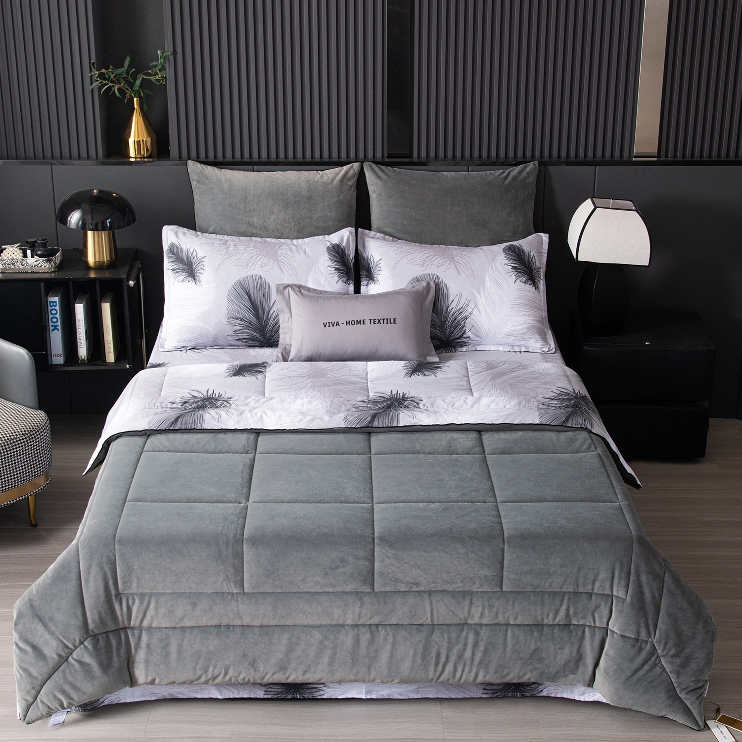 Габариты: 50 x 40 x 20 см, Упаковка: ПВХ сумка, Цвет: Белый; Светлый серо-серебристый; Черный; Зеленовато-серый; Средне-темный серый, Рисунок: Абстракция; Для бабушки; Для мужчин; Перья, Тип простыни: Обычная, Транспортировочная упаковка: 51.000/41.000/24.000, Состав: Велюр/100% хлопок | наполнитель одеяла- 100% эковолокно микрогель, Яндекс Видео: https-//disk.360.yandex.ru/i/WfED2r9tbAWLjw, Яндекс Фото: https-//disk.360.yandex.ru/d/TuBmqeIGdJTPBg, Яндекс Фото 3x4: https-//disk.360.yandex.ru/d/KnrnZm1WzBuUrQ, Комплект постельного белья Сатин Velouria Luxe с Одеялом - это сочетание изысканного дизайна; премиальных материалов и максимального комфорта. Вам больше не придётся тратить время на заправку одеяла в пододеяльник: его заменяет стеганое одеяло-покрывало; которое сразу идёт в комплекте и полностью соответствует дизайну белья, В комплект входят четыре наволочки: 50x70 см (2 шт) с запАхом (кармашком) выполнены из сатина 100% хлопка; с ушками и широким кантом по периметру; 70x70 см (2 шт) на молнии - верх из мягкого велюра; низ из сатина 100% хлопка; оформлены бархатным кантом, Ткань компаньон: Одеяло и наволочки 70x70 с разных сторон разной расцветки и ткани; наволочки 50x70 с разных сторон разной расцветки (принт/однотонный); простыня такого же цвета; как низ одеяла, Ткань: Сатин/Велюр, Плотность: 130 гр/м2 (сатин) / 240 гр/м2 (велюр), Метод окрашивания: Пигментное (сатин), Одеяло-покрывало (стеганое): 100% эковолокно микрогель (наполнитель), Наволочки 50x70: Украшены широким кантом по периметру, Наволочки 70x70: Украшены бархатным кантом по периметру, Одеяло-покрывало: 200*220 см 1 шт. (стеганое), Простыня: 230*250 см 1 шт. (классическая), Наволочки: 50*70 см 2 шт. (с запАхом) и 70*70 см 2 шт. (на молнии)