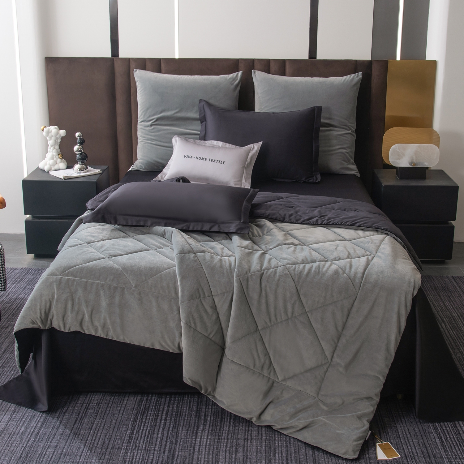 Габариты: 50 x 40 x 15 см, Цвет: Серый; Черный; Зеленовато-серый, Упаковка: ПВХ сумка, Тип простыни: На резинке, Транспортировочная упаковка: 51.000/41.000/24.000, Состав: Велюр/100% египетский хлопок | наполнитель одеяла- 100% эковолокно микрогель, Яндекс Видео: https-//disk.360.yandex.ru/i/V1UyJTRjORDB7g, Яндекс Фото: https-//disk.360.yandex.ru/d/Kp3Fbx8aUhzJlw, Яндекс Фото 3x4: https-//disk.360.yandex.ru/d/44HVyBruEFJayw, Особенность комплекта - наличие стёганого одеяла-покрывала; полностью готового к использованию. Вам не понадобится пододеяльник: одеяло сразу идёт в комплекте и идеально сочетается с постельным бельём; что делает уход за ним максимально удобным, Одеяло выполнено с изысканной геометрической стёжкой и оформлено бархатным кантом. Верхняя сторона - мягкий велюр; придающий комплекту благородный внешний вид и особую уютность. Нижняя сторона - гладкий сатин из 100% египетского хлопка; отличающийся особой прочностью; шелковистым блеском и естественной воздухопроницаемостью. Наполнитель - современное 100% эковолокно микрогель: лёгкий; гипоаллергенный материал; который сохраняет форму даже после многократных стирок. Зимой под таким одеялом тепло и комфортно; а летом - свежо и легко; благодаря отличной циркуляции воздуха, В комплект входят четыре наволочки: 50x70 см (2 шт) с запАхом (кармашком); выполненные из сатина 100% египетского хлопка; с ушками и широким кантом по периметру; 70x70 см (2 шт) на молнии - верх из мягкого велюра; низ из сатина 100% египетского хлопка; оформлены бархатным кантом, Ткань компаньон: Одеяло и наволочки 70x70 с разных сторон разной расцветки и ткани; наволочки 50x70 однотонные; простыня такого же цвета; как низ одеяла, Ткань: Сатин/Велюр, Плотность: 150 гр/м2 (сатин) / 240 гр/м2 (велюр), Метод окрашивания: 3D окрашивание (сатин), Одеяло-покрывало (стеганое): 100% эковолокно микрогель (наполнитель), Наволочки 50x70: Украшены широким кантом по периметру, Наволочки 70x70: Украшены бархатным кантом по периметру, Одеяло-покрывало: 200*220 см 1 шт. (стеганое), Простыня: (180/160/140)*200*25 см 1 шт. (на резинке), Наволочки: 50*70 см 2 шт. (с запАхом) и 70*70 см 2 шт. (на молнии)