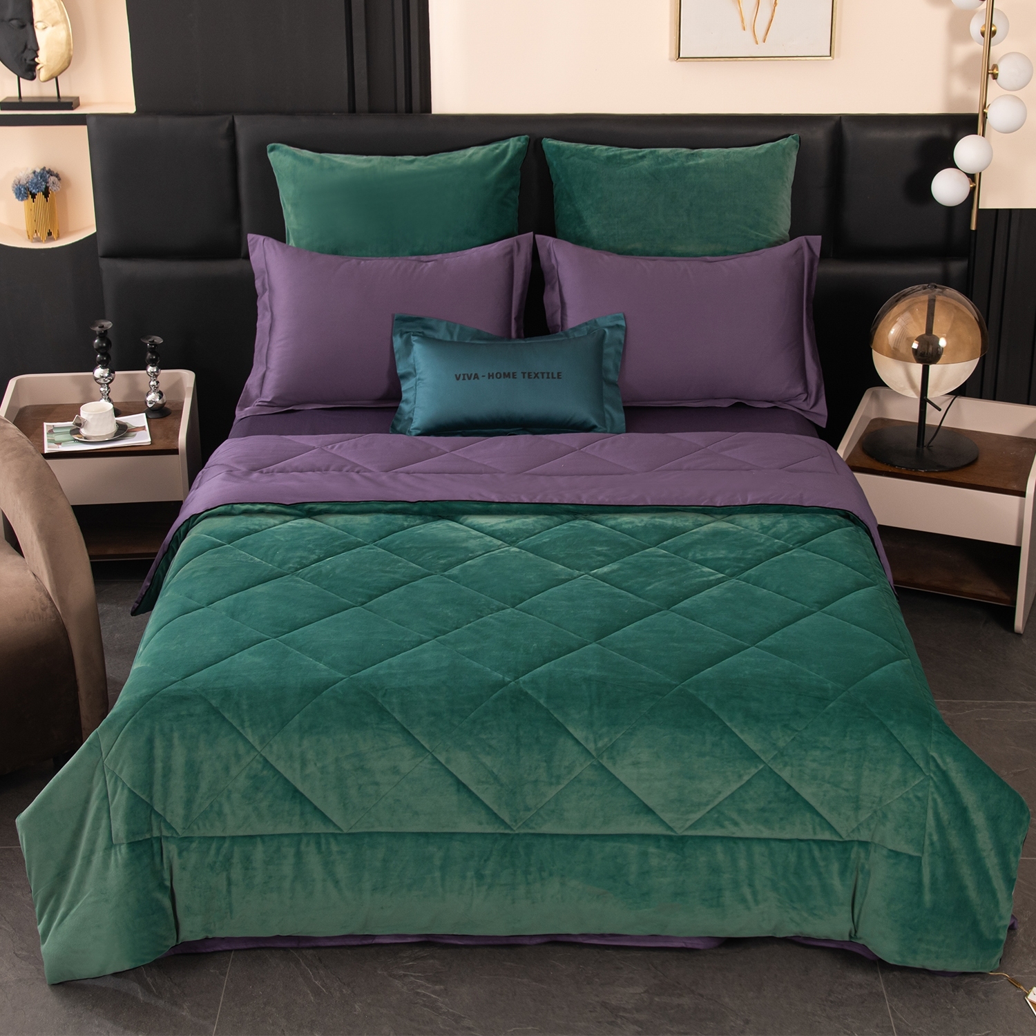 Габариты: 50 x 40 x 15 см, Упаковка: ПВХ сумка, Цвет: Насыщенный зеленый; Темно-зеленый; Фиолетовый, Тип простыни: Обычная, Транспортировочная упаковка: 51.000/41.000/24.000, Состав: Велюр/100% египетский хлопок | наполнитель одеяла- 100% эковолокно микрогель, Яндекс Видео: https-//disk.360.yandex.ru/i/oCuXc7RBeaqciA, Яндекс Фото: https-//disk.360.yandex.ru/d/HSGuQHyPT40O0A, Яндекс Фото 3x4: https-//disk.360.yandex.ru/d/Iy4AOPSQMcxKiA, Особенность комплекта - наличие стёганого одеяла-покрывала; полностью готового к использованию. Вам не понадобится пододеяльник: одеяло сразу идёт в комплекте и идеально сочетается с постельным бельём; что делает уход за ним максимально удобным, Одеяло выполнено с изысканной геометрической стёжкой и оформлено бархатным кантом. Верхняя сторона - мягкий велюр; придающий комплекту благородный внешний вид и особую уютность. Нижняя сторона - гладкий сатин из 100% египетского хлопка; отличающийся особой прочностью; шелковистым блеском и естественной воздухопроницаемостью. Наполнитель - современное 100% эковолокно микрогель: лёгкий; гипоаллергенный материал; который сохраняет форму даже после многократных стирок. Зимой под таким одеялом тепло и комфортно; а летом - свежо и легко; благодаря отличной циркуляции воздуха, В комплект входят четыре наволочки: 50x70 см (2 шт) с запАхом (кармашком); выполненные из сатина 100% египетского хлопка; с ушками и широким кантом по периметру; 70x70 см (2 шт) на молнии - верх из мягкого велюра; низ из сатина 100% египетского хлопка; оформлены бархатным кантом, Ткань компаньон: Одеяло и наволочки 70x70 с разных сторон разной расцветки и ткани; наволочки 50x70 однотонные; простыня такого же цвета; как низ одеяла, Ткань: Сатин/Велюр, Плотность: 150 гр/м2 (сатин) / 240 гр/м2 (велюр), Метод окрашивания: 3D окрашивание (сатин), Одеяло-покрывало (стеганое): 100% эковолокно микрогель (наполнитель), Наволочки 50x70: Украшены широким кантом по периметру, Наволочки 70x70: Украшены бархатным кантом по периметру, Одеяло-покрывало: 200*220 см 1 шт. (стеганое), Простыня: 230*250 см 1 шт. (классическая), Наволочки: 50*70 см 2 шт. (с запАхом) и 70*70 см 2 шт. (на молнии)